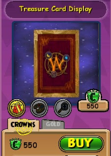 Wizard101 introduced the treasure display, for 550 crowns each you can display all of your most valued cards. as seen below you can see the full version treasure card display. This version is great to show off your most priced treasure cards.